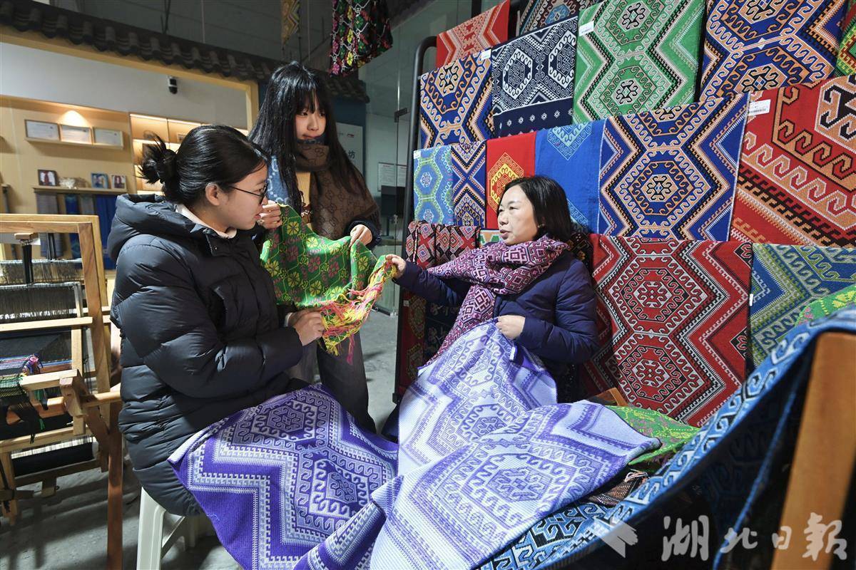 1月22日,恩施州西兰卡普生产基地,传承人田若兰(右)正在向两名大学生讲解新技术与传统织法的区别。