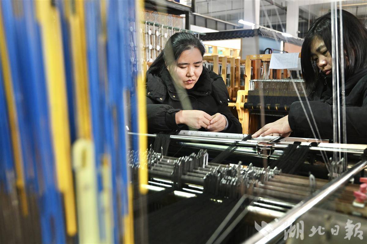 1月22日,恩施州西兰卡普生产基地内,工作人员正在改良织机上安装织锦经线。