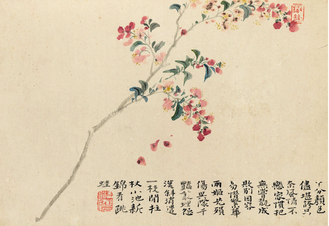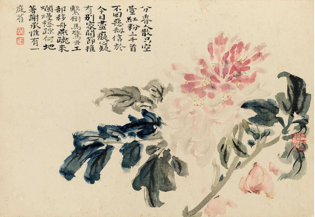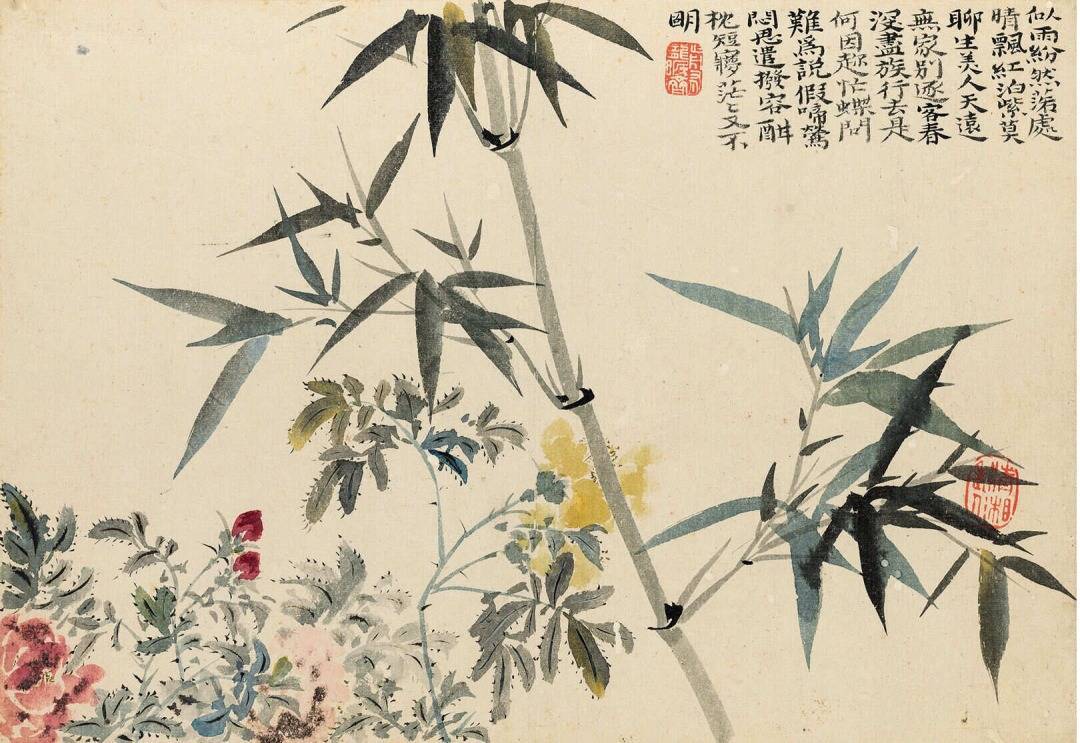 更绝的是,他专挑“野路子”构图。别人画牡丹必配牡丹,他偏让墨竹和芭蕉“同框”,一黑一绿撞得热闹;海棠不种在盆里,倒像是从墙头探出来的,风一吹,花瓣簌簌往题诗上落,诗和画搅成一锅“江南春粥”。