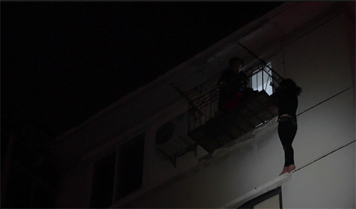 救援人员到场后发现,现场情况令围观市民惊出一身冷汗:一名女子整个身体翻出五楼窗外护栏,双手紧紧抓住护栏,身体紧贴居民楼外墙,没穿鞋的双脚踩在楼下窗户上方不足10厘米宽的装饰沿上,摇摇欲坠,情况十分危急。