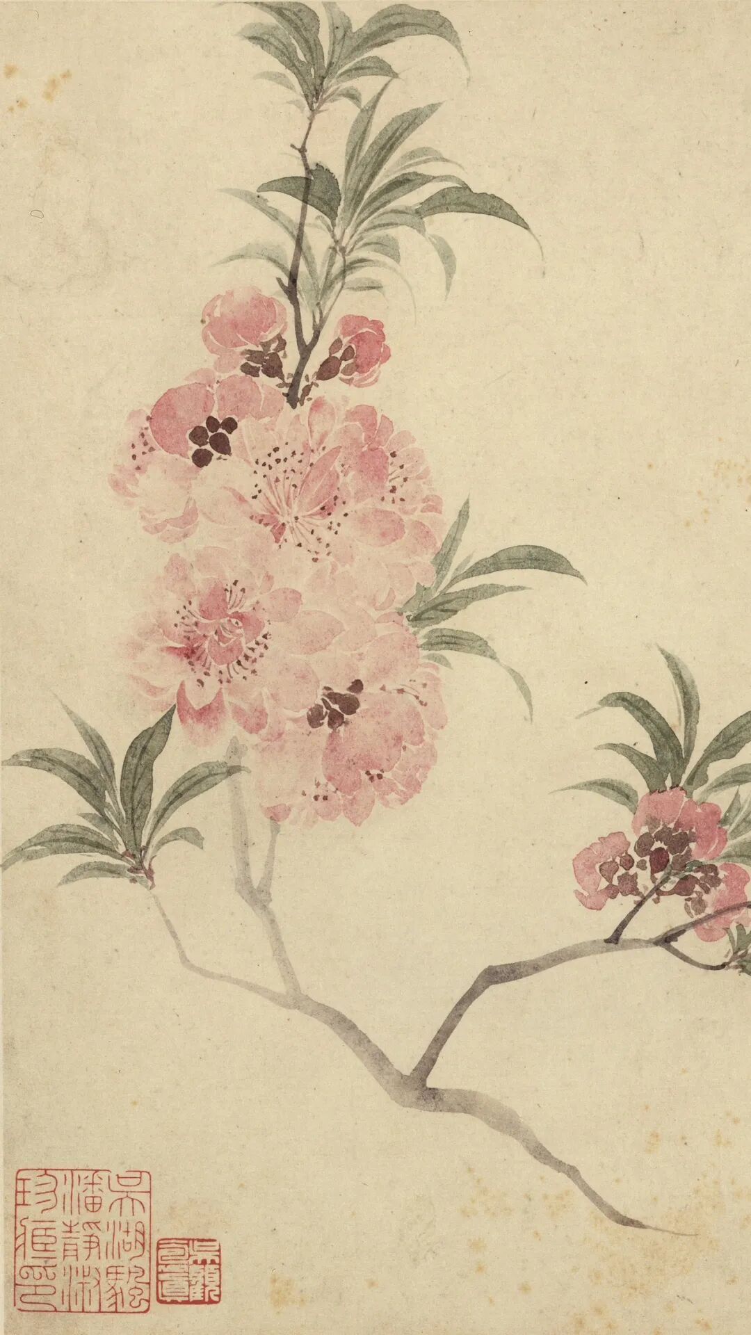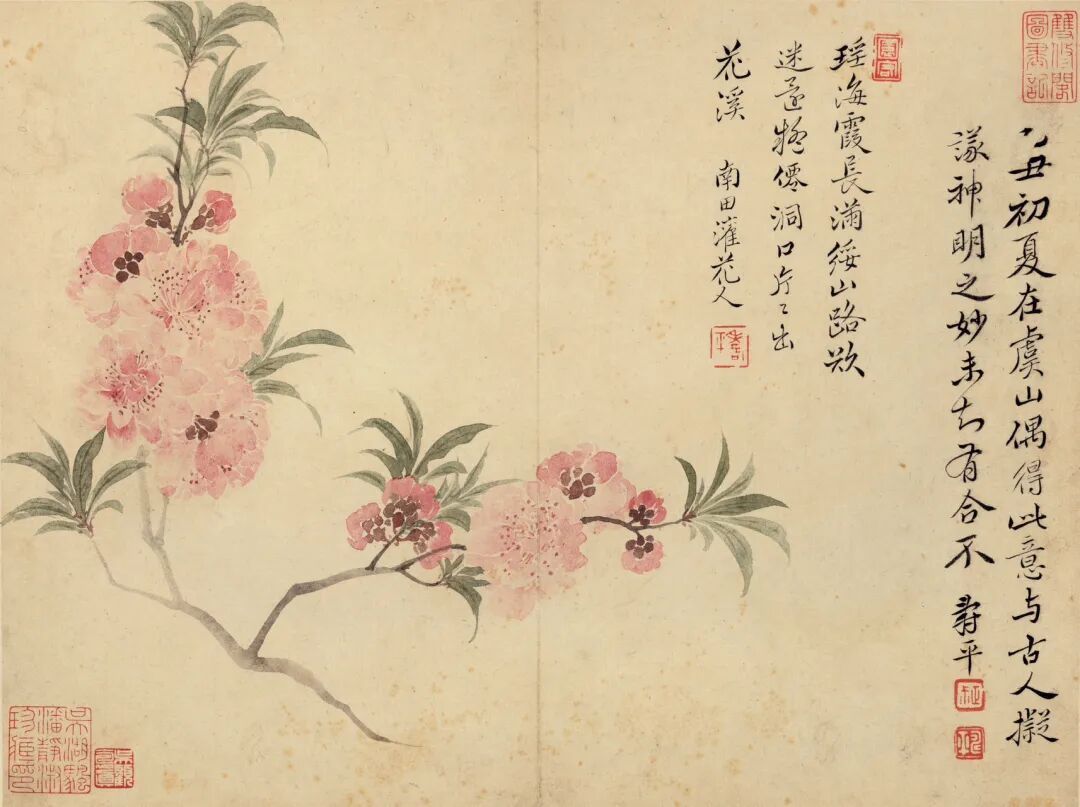 恽寿平这八幅春花小品,表面看是“花花世界”,实则是用没骨法玩了一场色彩与意境的“高级游戏”。他不用线条勾勒,直接拿颜色“堆”出花瓣,像第一开的粉色花朵,花瓣边缘晕染得像少女脸颊的薄红,连叶脉都透着工笔的精细,却偏要摆出写意的潇洒——这手“隐线藏形”的功夫,让花看起来像从纸上“长”出来的。