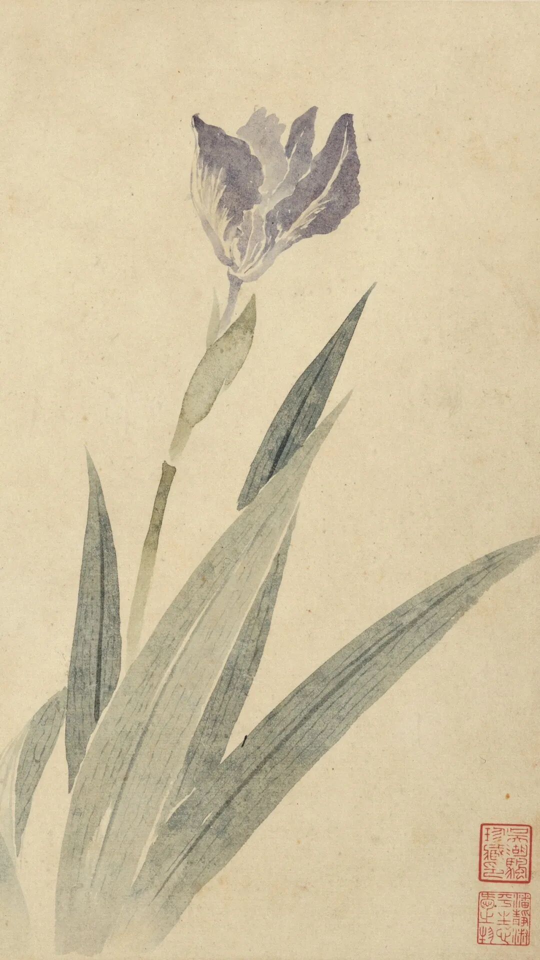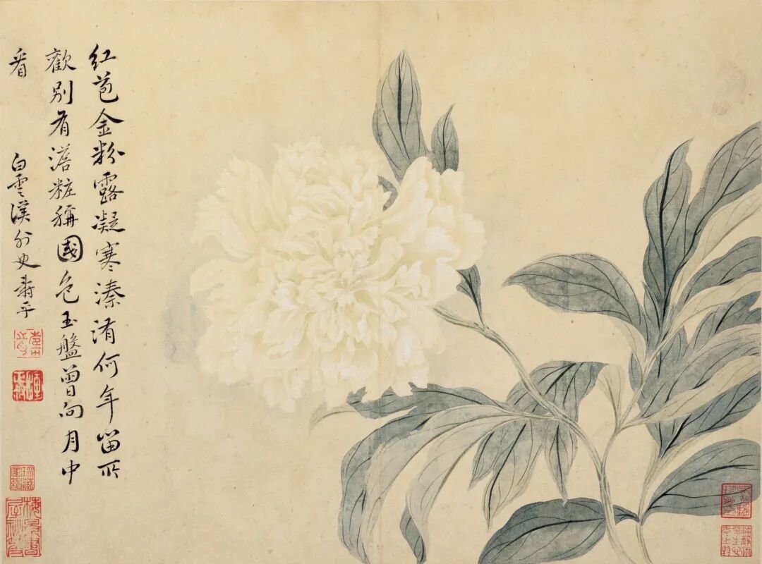 更妙的是,每幅画都藏着小心思。紫鸢尾那句“花丛不数旧时群”,明写花,暗喻自己避世不争;白牡丹“别有澹妆称国色”,直接吐槽世人追捧的富贵艳俗,偏要画朵素到骨子里的牡丹,用“澹极始知花更艳”的文人傲气,把世俗审美按在地上摩擦。