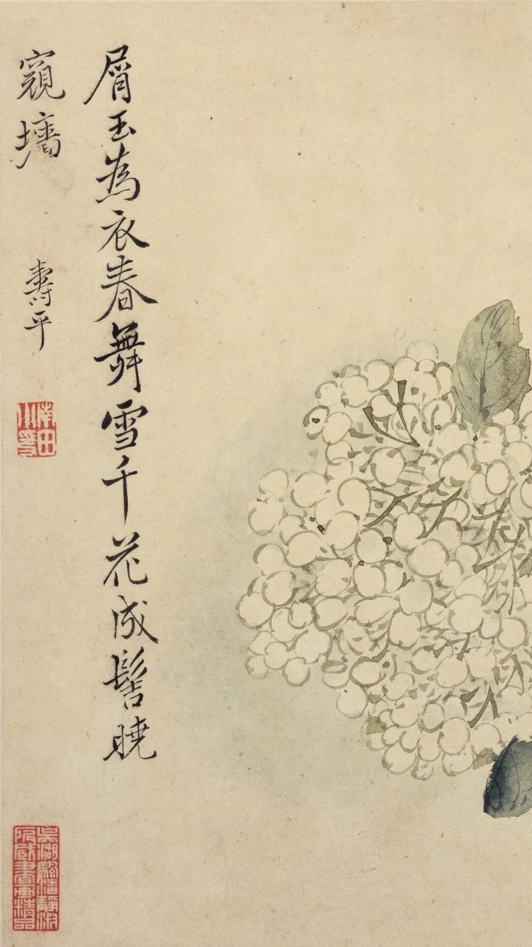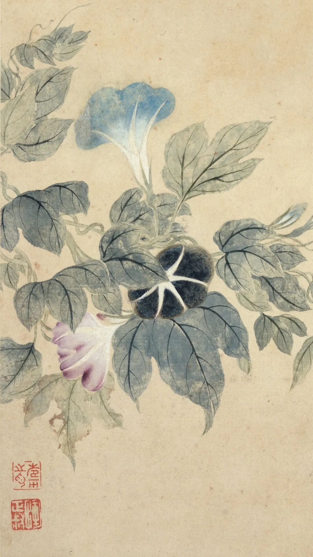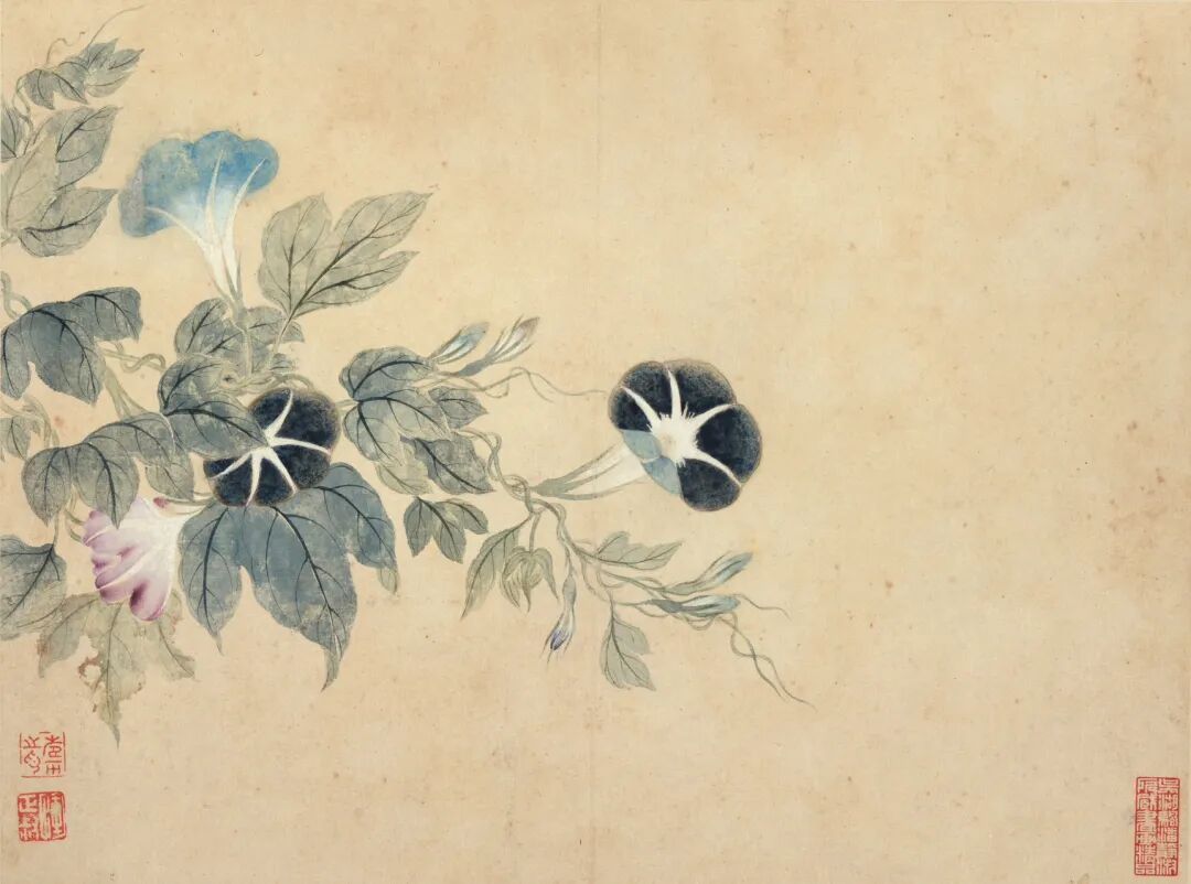 最绝的是“无声胜有声”的留白。牵牛花三色缠绕,没题诗却用藤蔓的蜿蜒说尽春之絮语;绣球花“屑玉为衣春舞雪”,光是名字就让人脑补出花瓣飘落的动态,连印章朱红都成了画面里的“点睛之笔”。