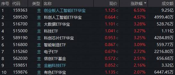 双线布局“算力+AI应用”的创业板人工智能ETF(159363)跳空突破所有均线,场内放量暴涨6.53%!重仓国产AI产业链的科创人工智能ETF华宝(589520)场内放量反弹4.57%!全“芯”科创芯片ETF华宝(589190)高开高走,场内放量涨逾3%收复5日线!