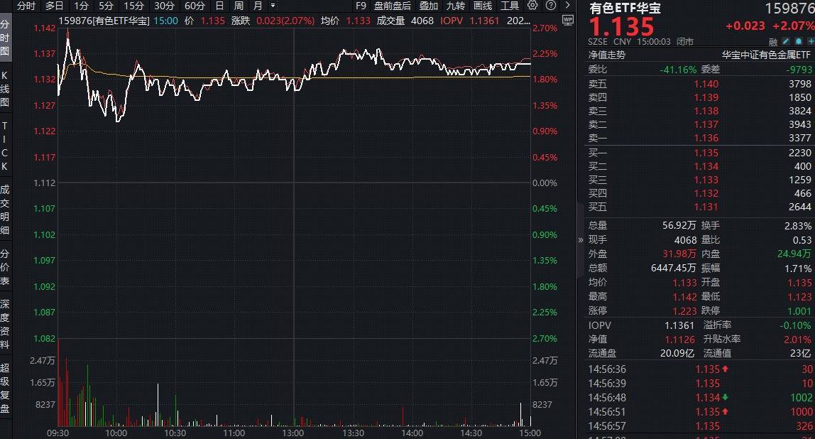 或由于现货黄金重返5000美元提振市场情绪,揽尽有色金属行业龙头的有色ETF华宝(159876)全天高位活跃,场内价格盘中拉升2.5%,收涨2.07%。成份股方面,盛和资源、湖南白银涨停,白银有色涨超8%,中国稀土涨逾6%,北方稀土、中稀有色等个股跟涨。