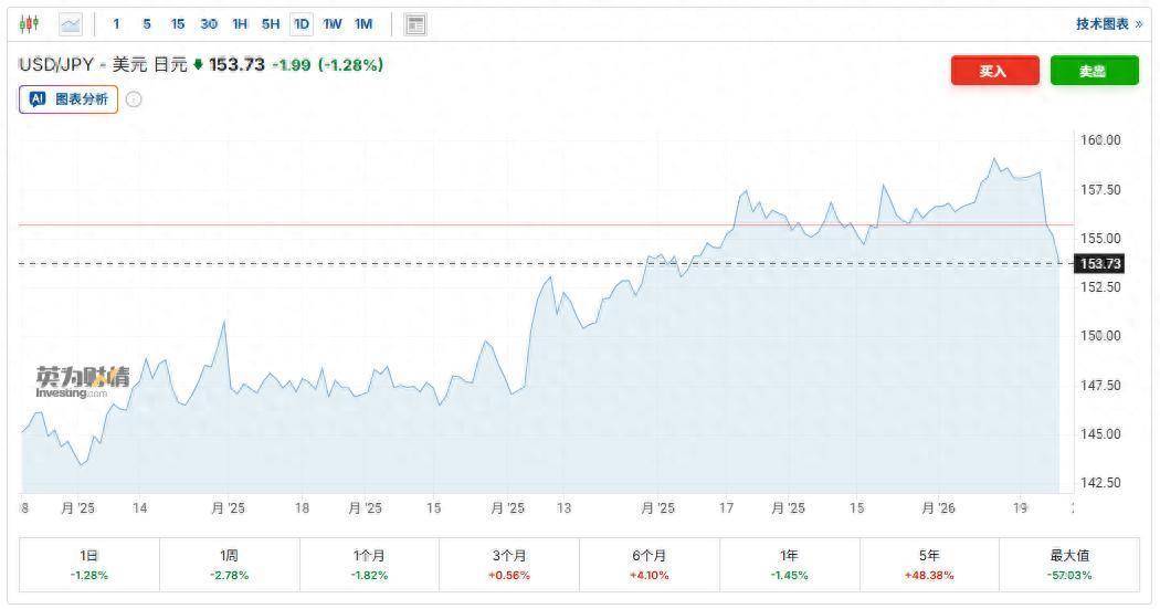 上周五,日元曾一度出现近六个月来的最大单日涨幅。周一,日元继续走高。截至发稿,美元兑日元汇率跌1.28%,报153.73,为去年11月以来的最低水平。