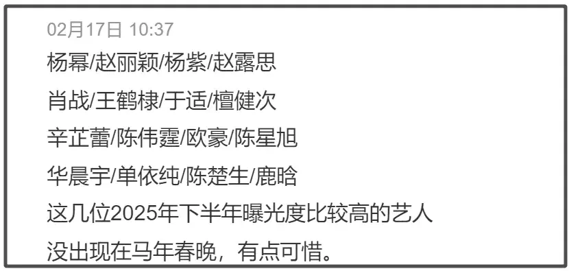 而2025年内娱含金量最大奖项,威尼斯电影节影后获得者辛芷蕾,没有参与春晚录制。可能辛芷蕾之前参与过了,马年想回家过年吧。